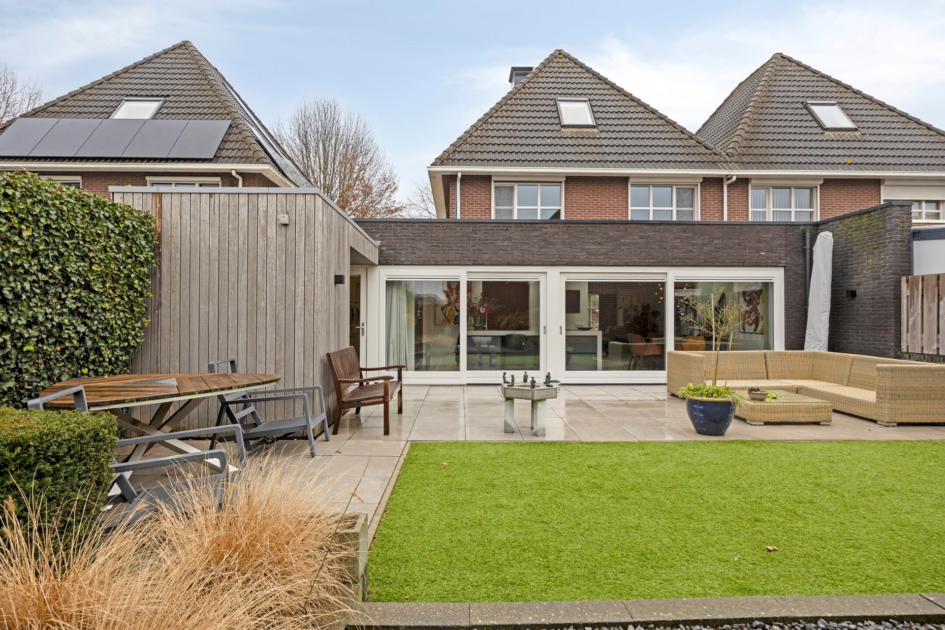 De tuinberging is via een ruime overkapping vanuit de tuindeur van de bijkeuken verbonden met de woning en het grote terras.