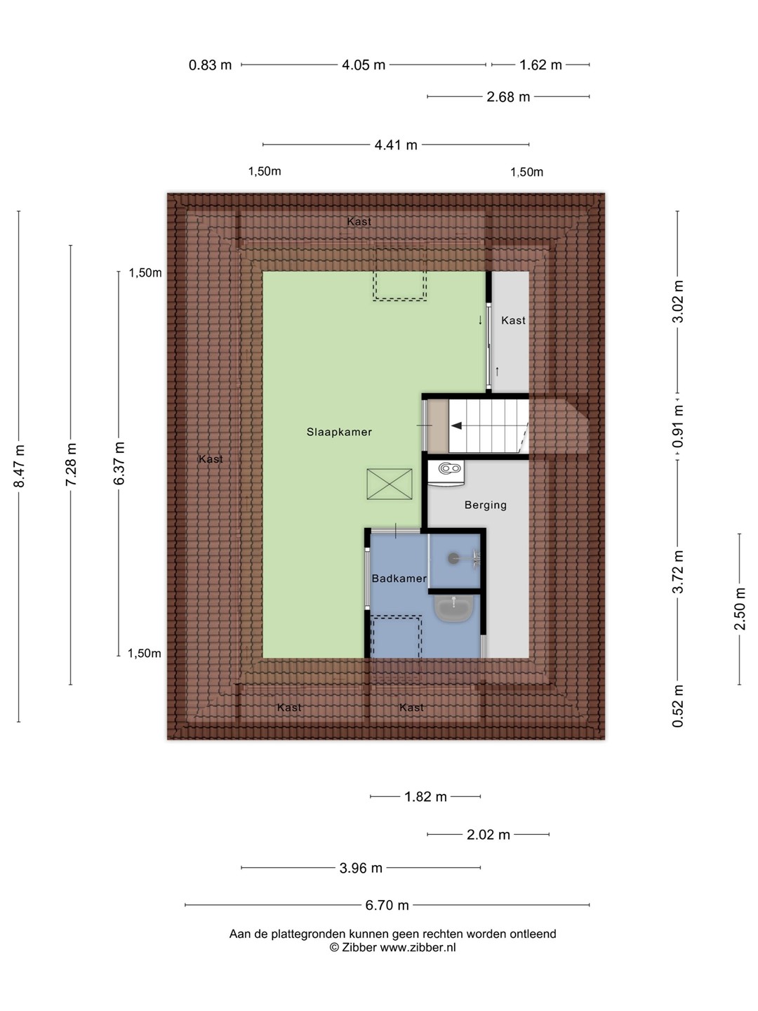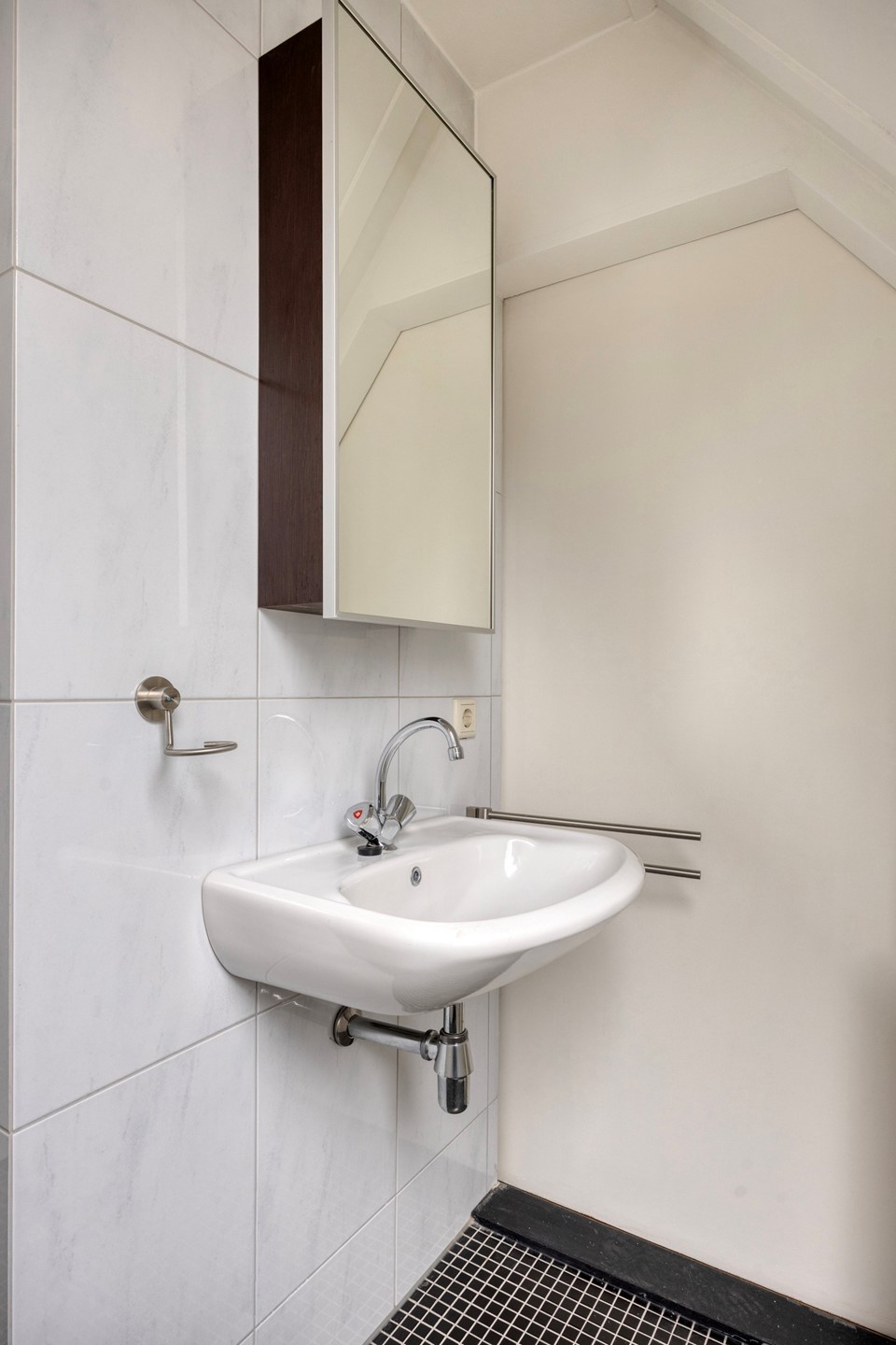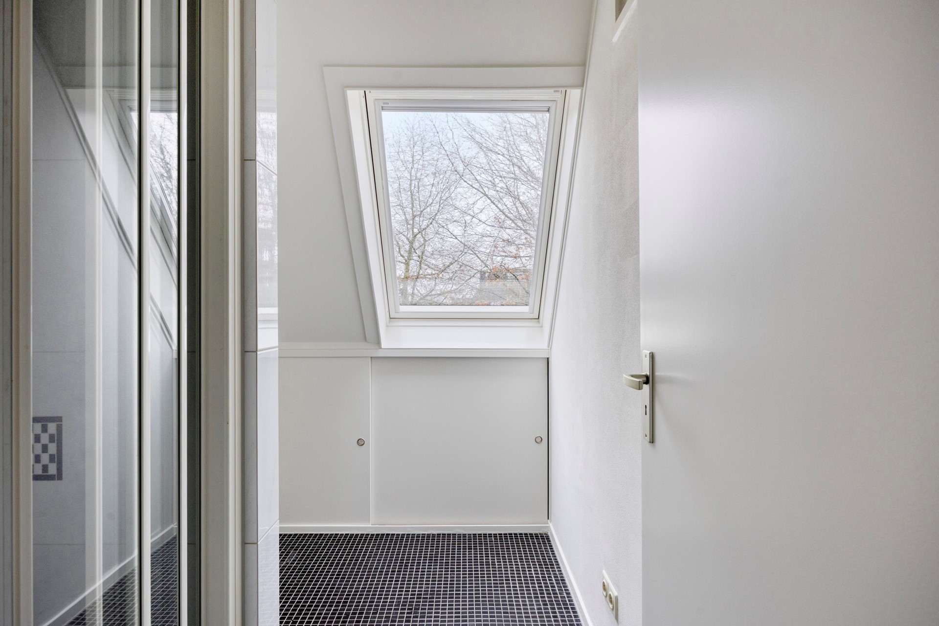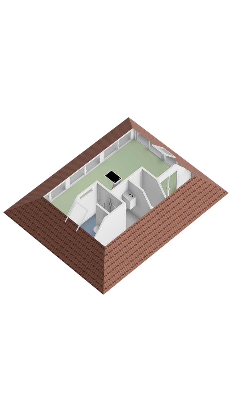 Vanuit de slaapkamer is er toegang tot de badkamer met Velux dakraam, vaste wastafel met spiegel, douche, bergruimte achter de knieschotten. Vanuit de badkamer is de grote bergruimte bereikbaar.