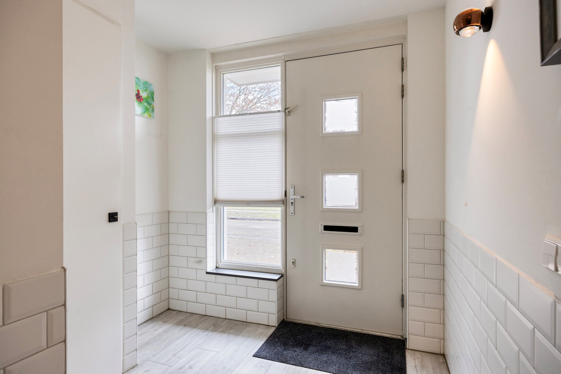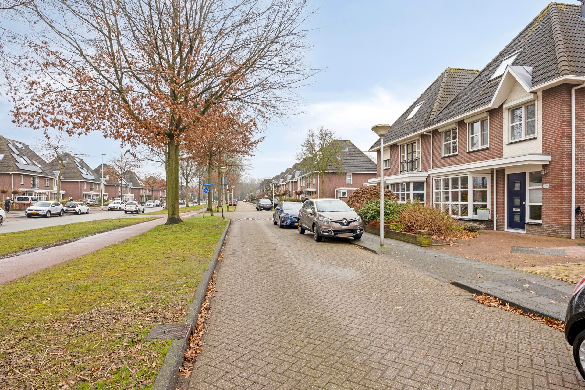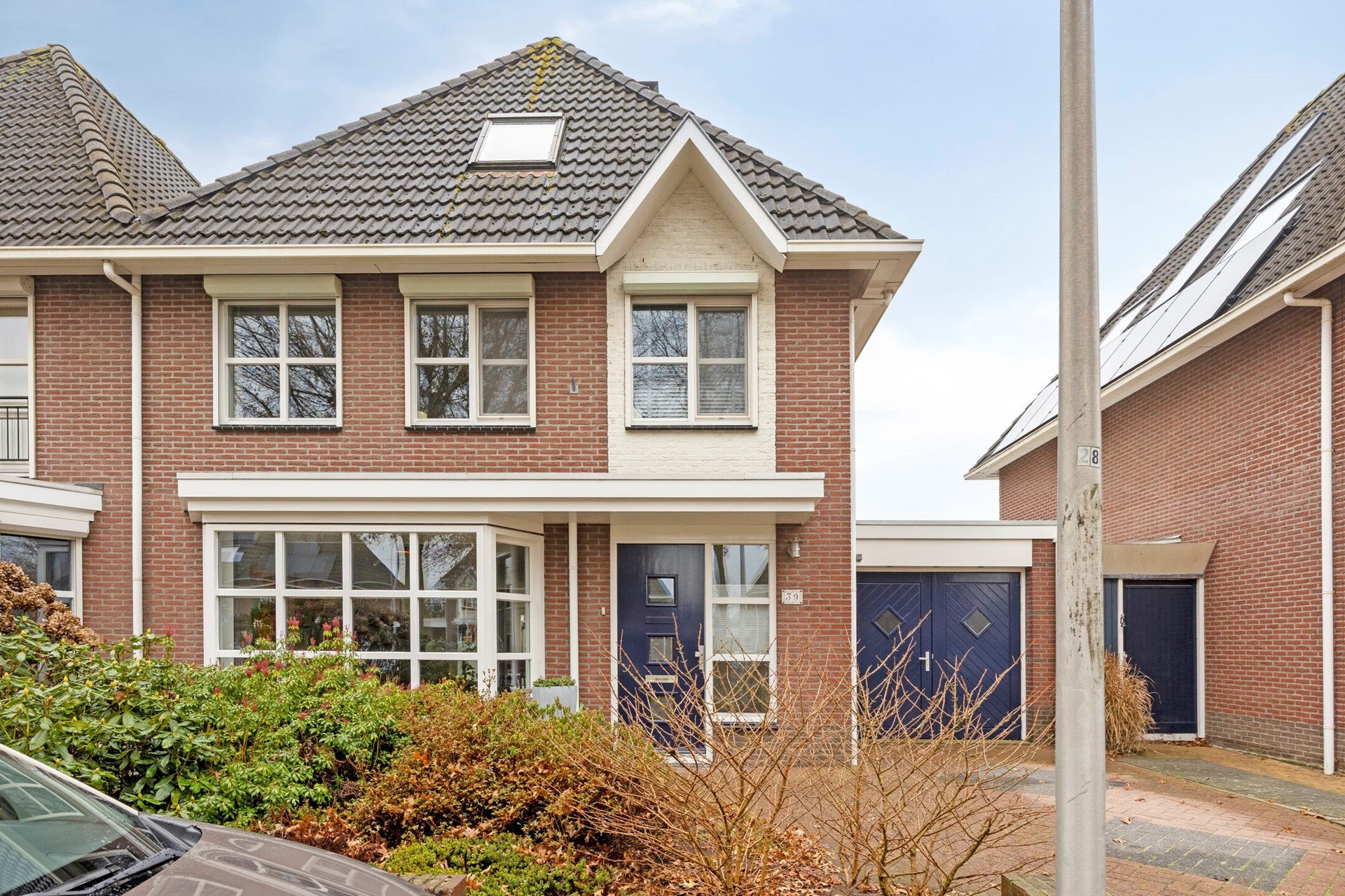 Via de fraai aangelegde voortuin met garage-oprit en laadpaal voor de elektrische auto is er toegang tot de overdekte entree.