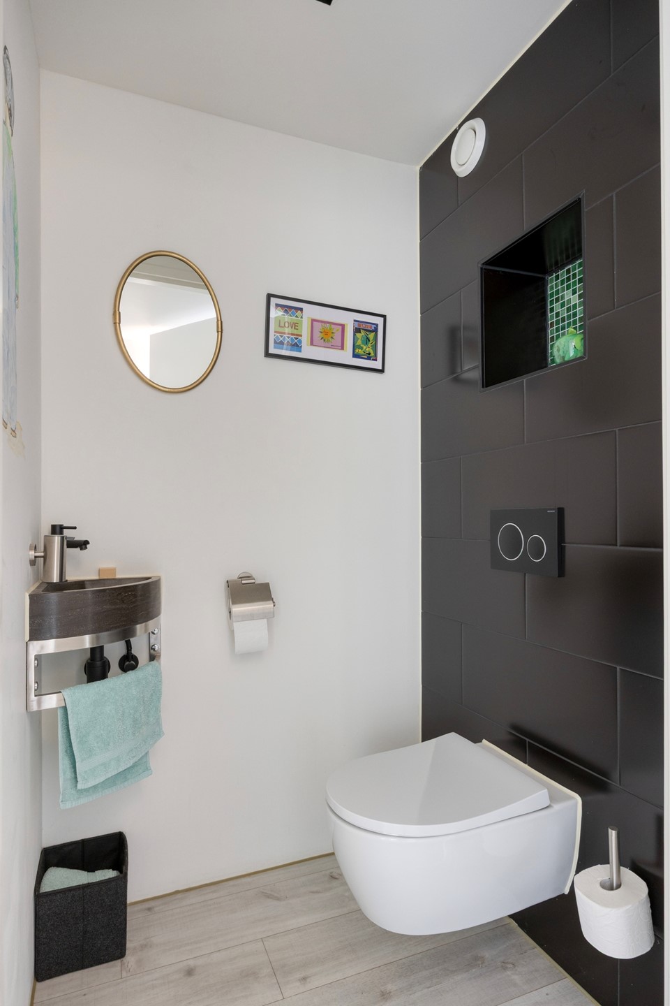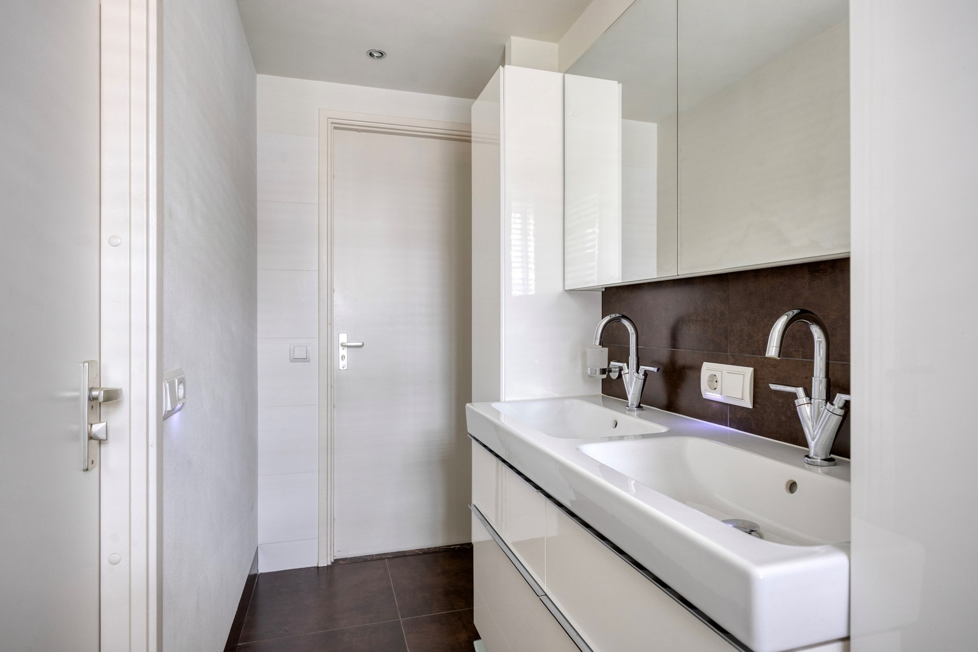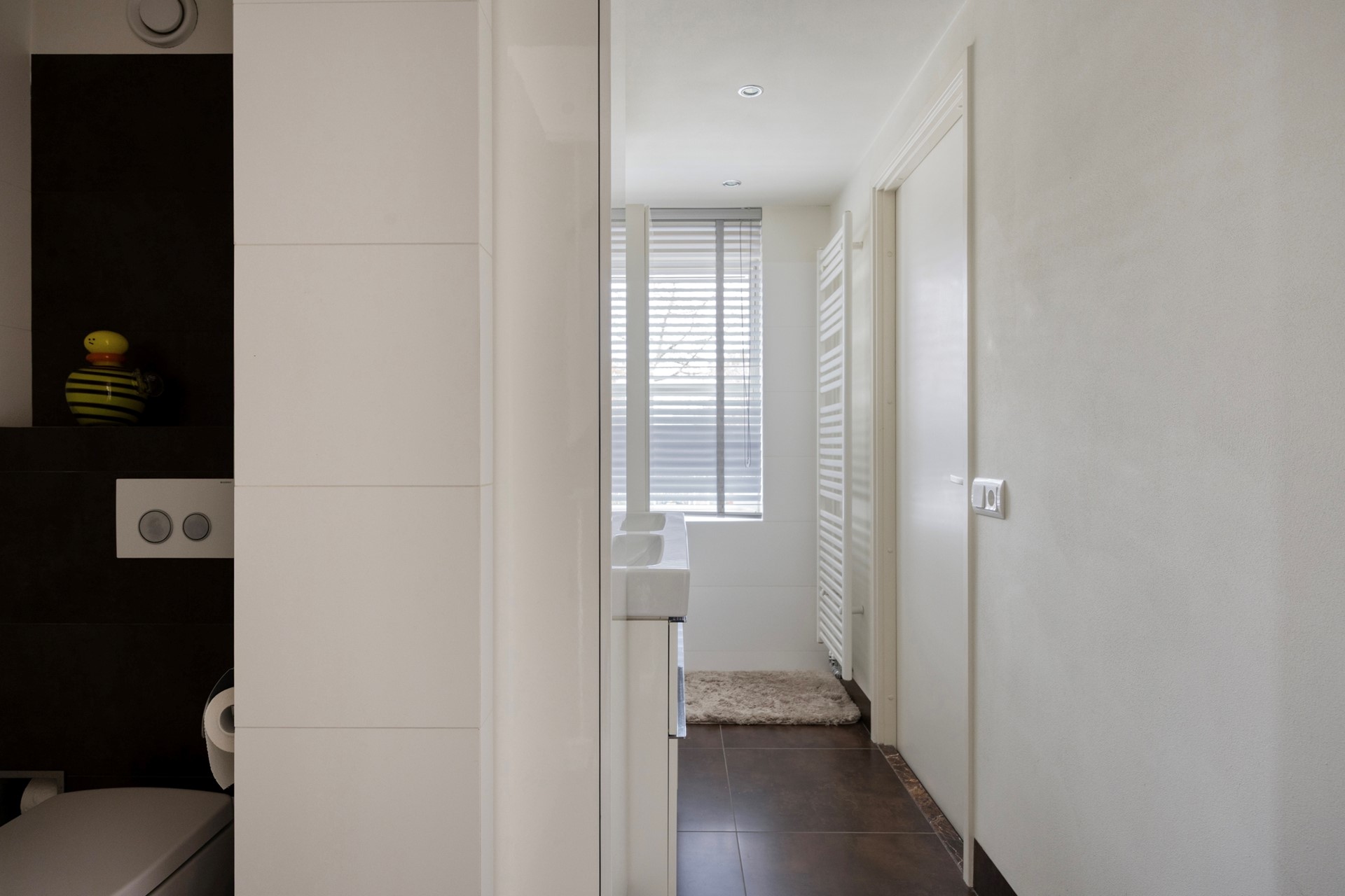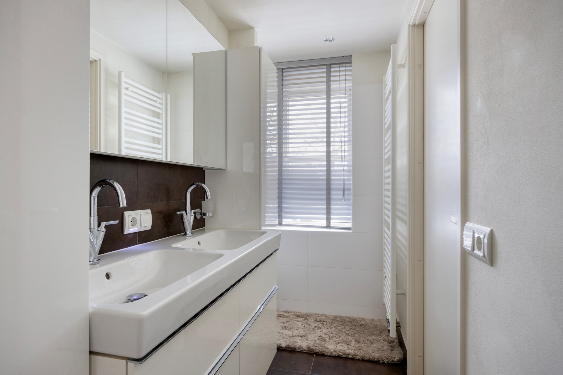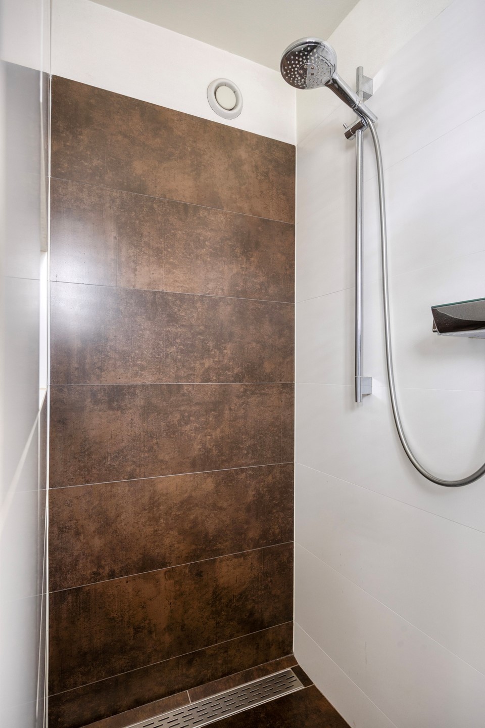 Badkamer: De betegelde moderne badkamer heeft mechanische ventilatie, een wandcloset, wastafelmeubel met bovenkastjes met spiegel en onderladen, een inloopdouche en een designradiator.