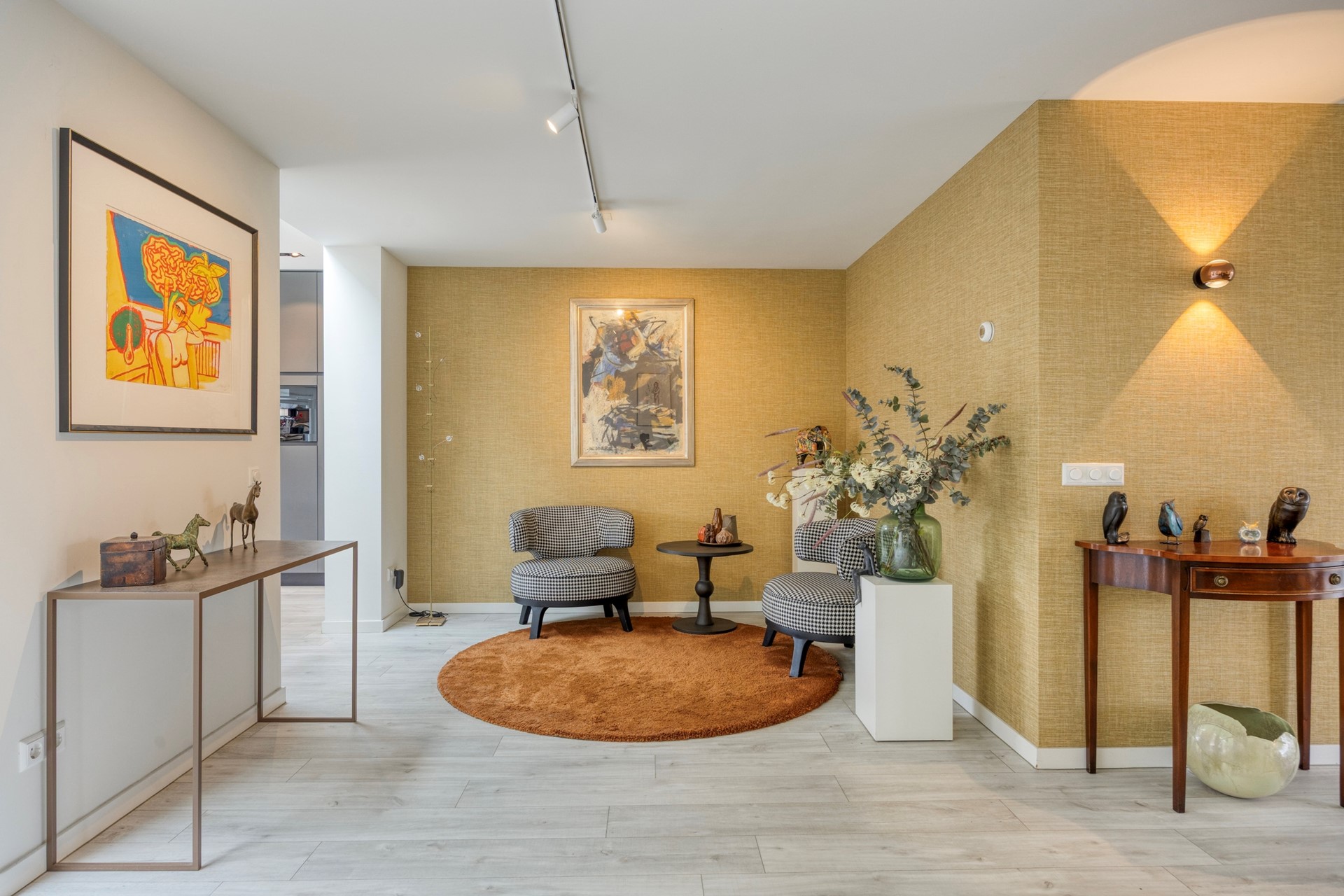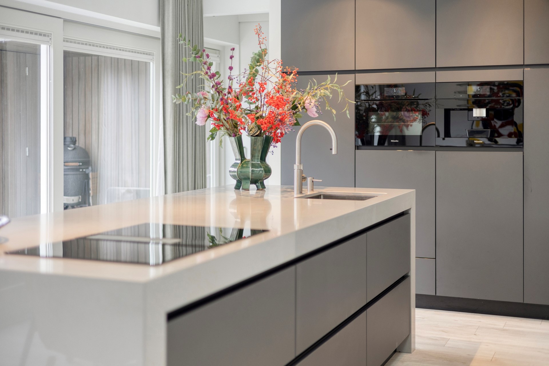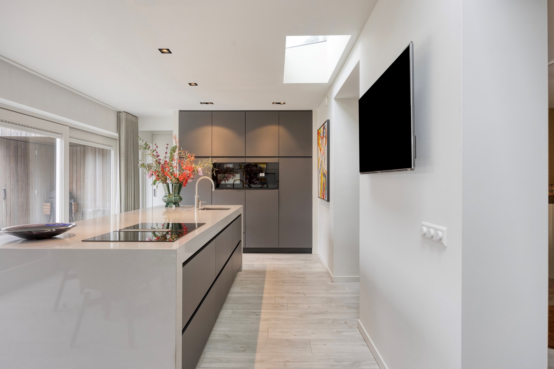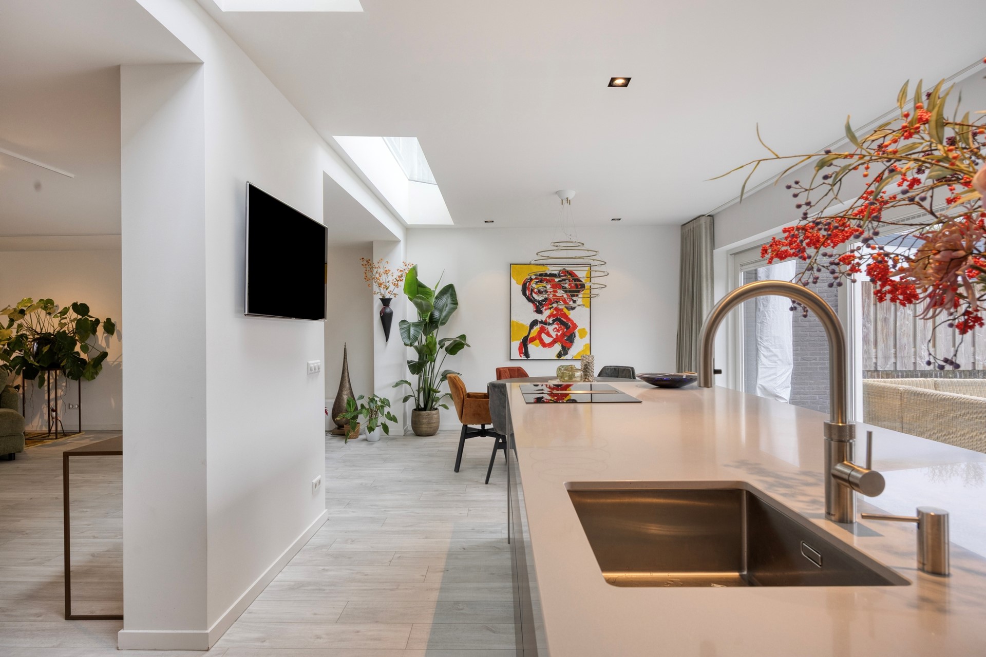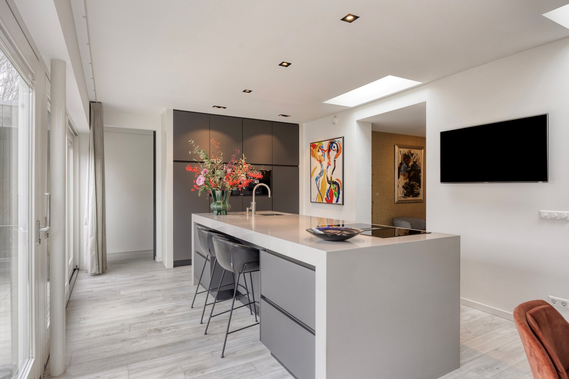 De keuken: De keuken is ontworpen door high-end keukenontwerper Hans Kwinten Interieurprojecten uit Bergeijk. De keuken is geplaatst in 2020 en omvat een kookeiland met composiet blad, onderbouw laden en kastjes, een Bora inductie kookplaat met down-draft-afzuiging en een spoelbak met Quooker-kraan. Aan de tuinzijde van het kookeiland bevindt zich een eetbar met bergladen. In de kastenwand met laden, bergkasten en inbouwapparatuur bevinden zich een Miele koelkast, Miele oven, Miele vaatwasser en een Miele koffiezetapparaat met wateraansluiting en dubbel bonenreservoir.