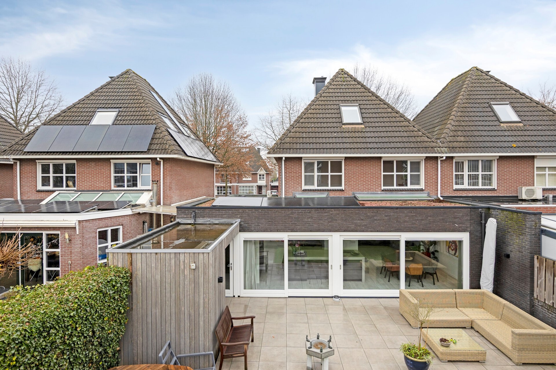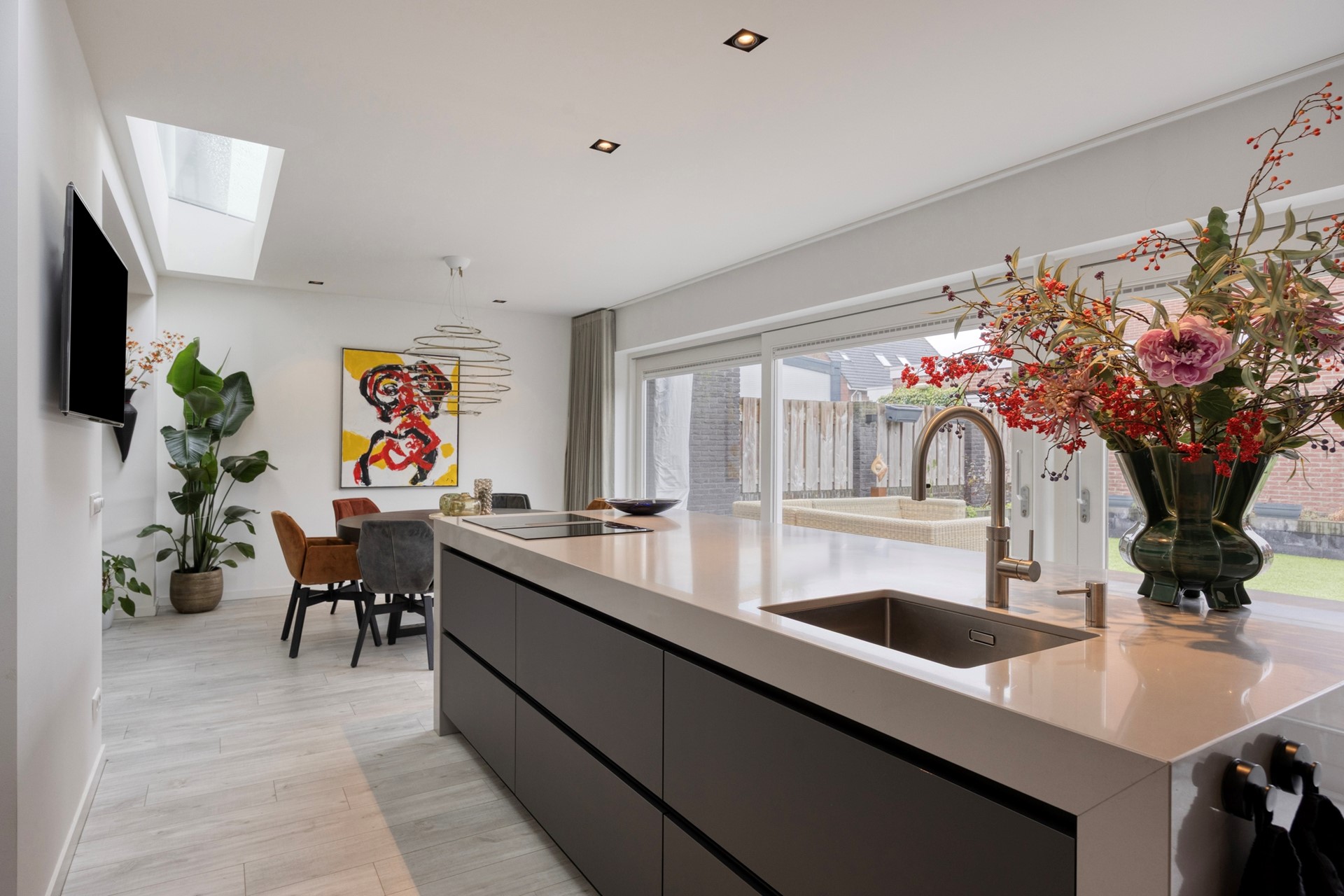 De uitbouw met een royale eethoek en de moderne design-keuken is in 2020 gerealiseerd. In het plafond bevinden zich dimbare inbouwspots en een lichtstraat waardoor ook hier veel daglichttoetreding. Over de volle breedte van de uitbouw zijn het terras en de tuin via twee grote hardhouten schuifdeuren met beglazing toegankelijk. Op het met sedum beplante platte dak van de uitbouw bevinden zich 6 zonnepanelen.