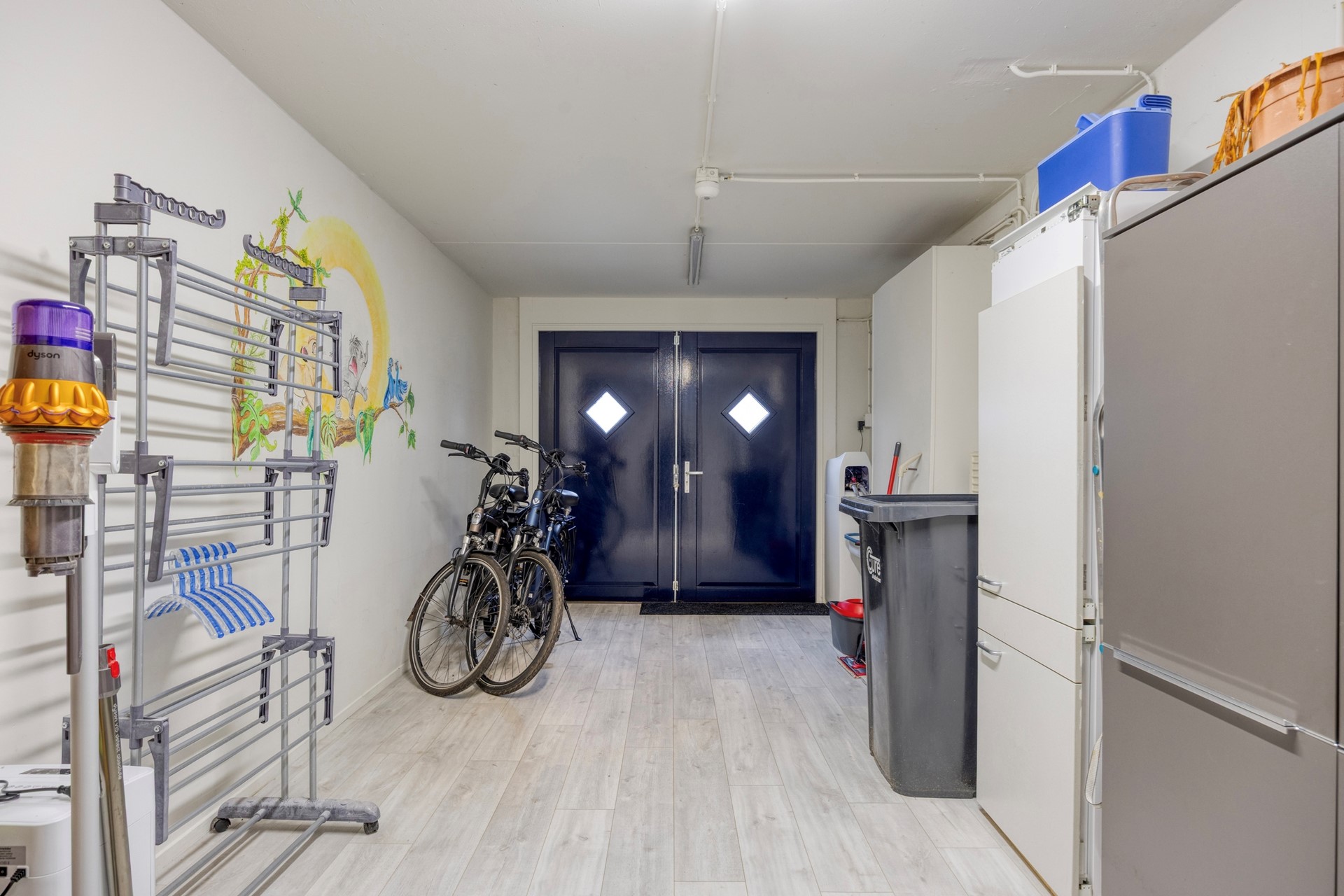 De garage: De garage heeft een dubbele houten garagedeur met kleine raampjes, een waterontkalker, een stortbakje en een automatische bewegingsschakelaar voor de verlichting.