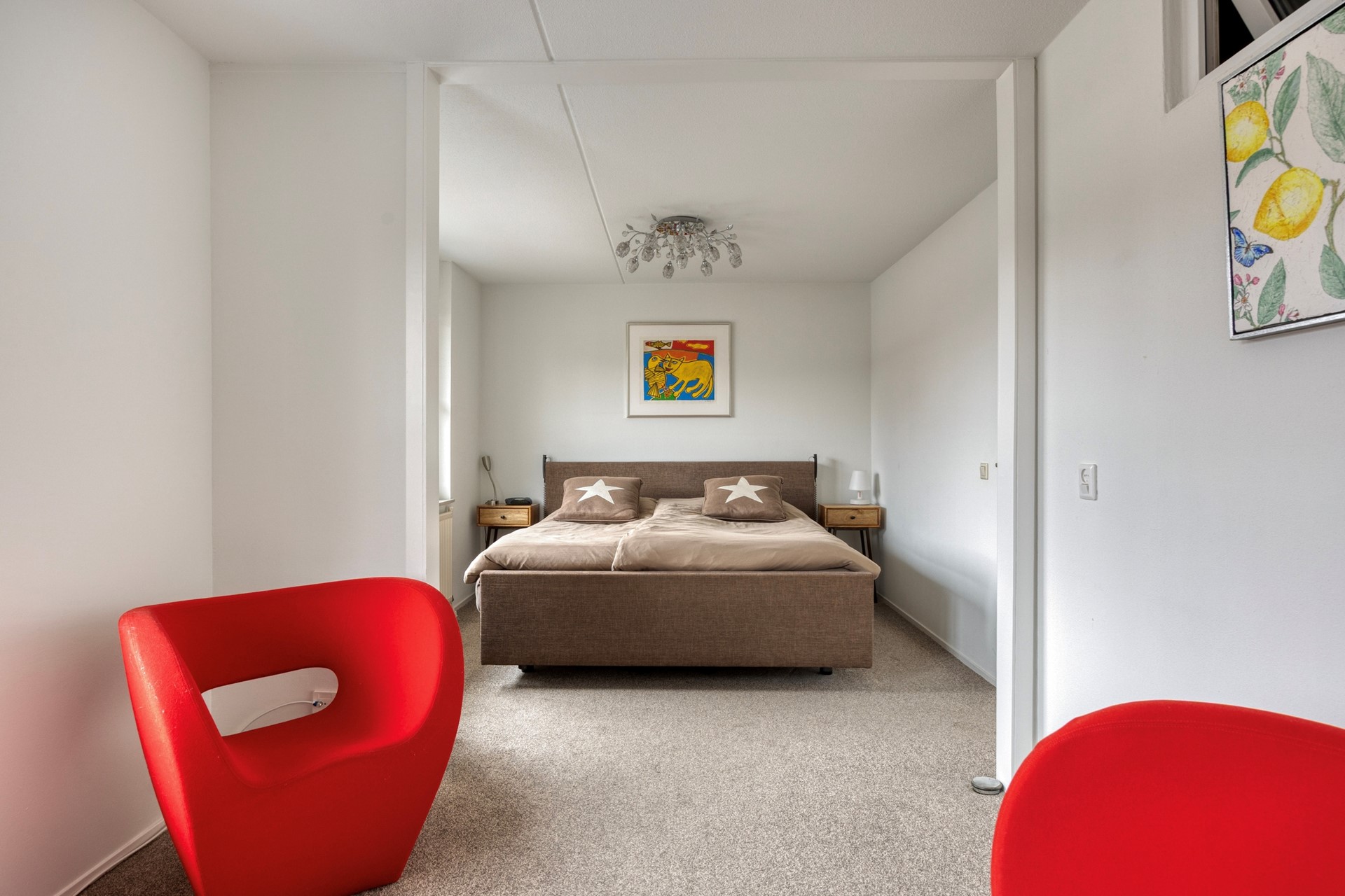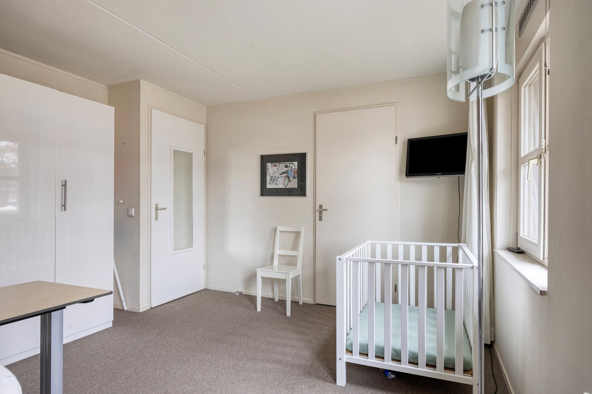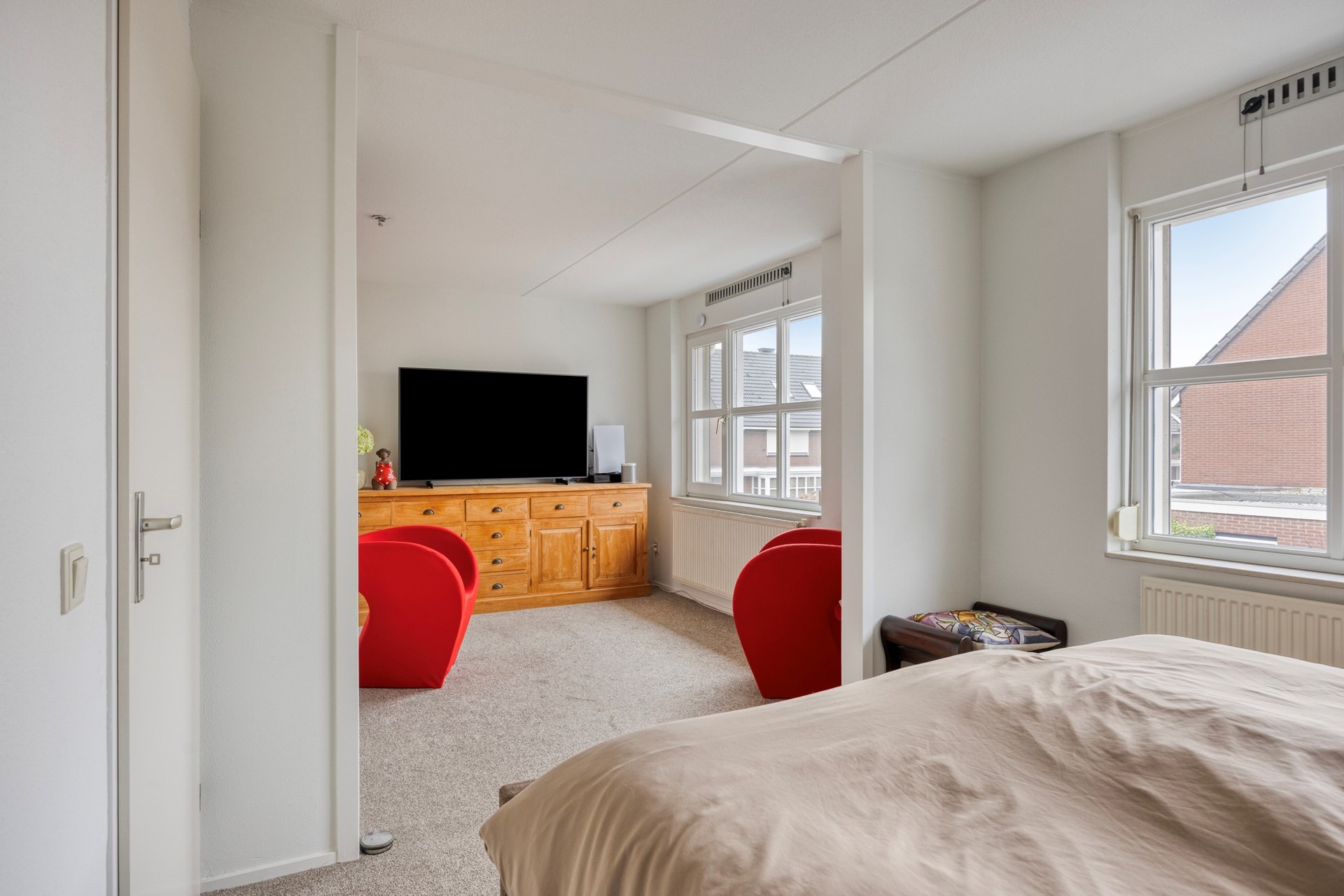 Slaapkamer voorzijde: Deze slaapkamer was de oorspronkelijke ouderslaapkamer. Via een deur is er directe toegang tot de naastgelegen badkamer.