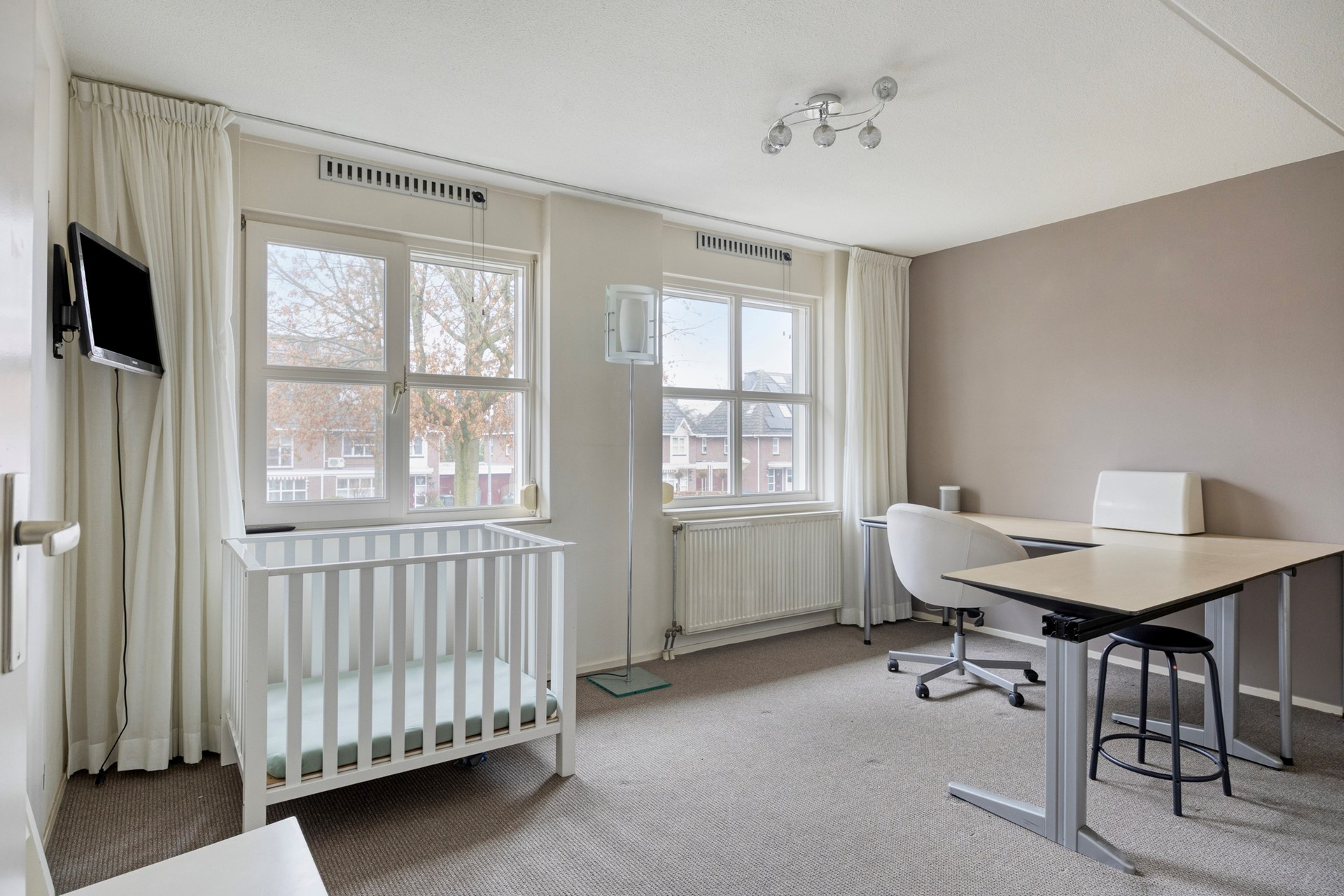 Slaapkamer achterzijde: Deze grote slaapkamer is ontstaan door de gedeeltelijke samentrekking van beide slaapkamers aan de achterzijde. Door de samentrekking van beide slaapkamers is door een extra tussenwand-plaatsing een ruime walk-incloset ontstaan. Deze situatie is eenvoudig weer in de originele toestand terug te brengen waardoor er op de eerste verdieping weer 3 royale slaapkamers zijn.