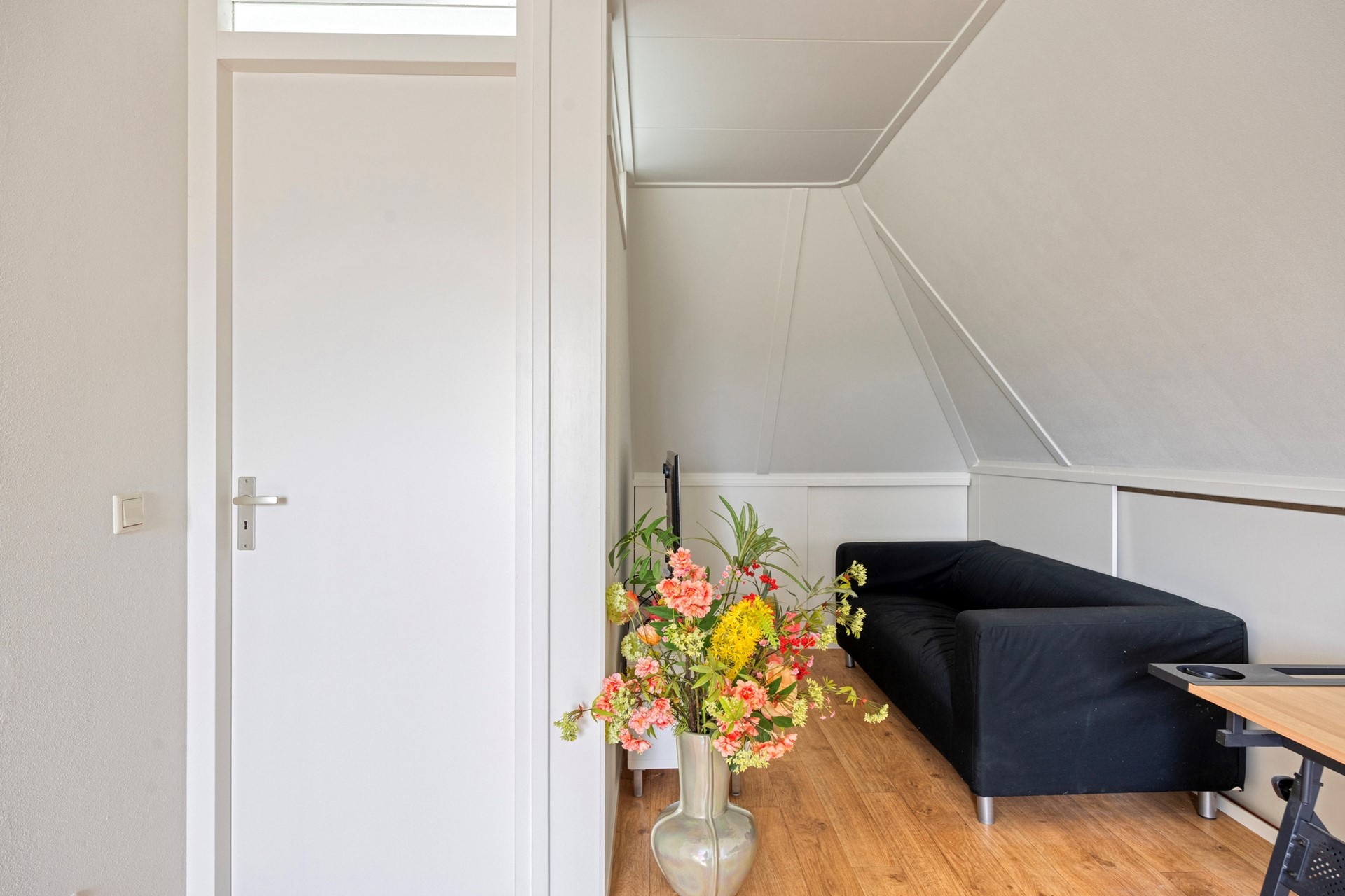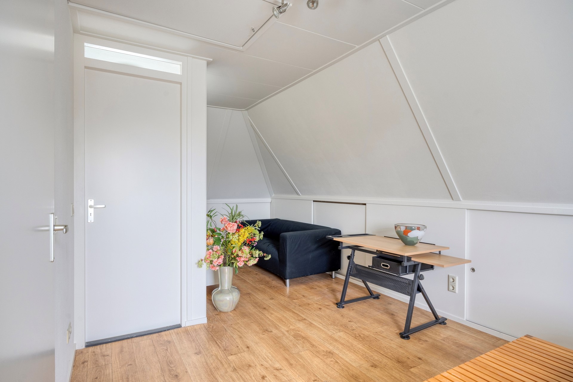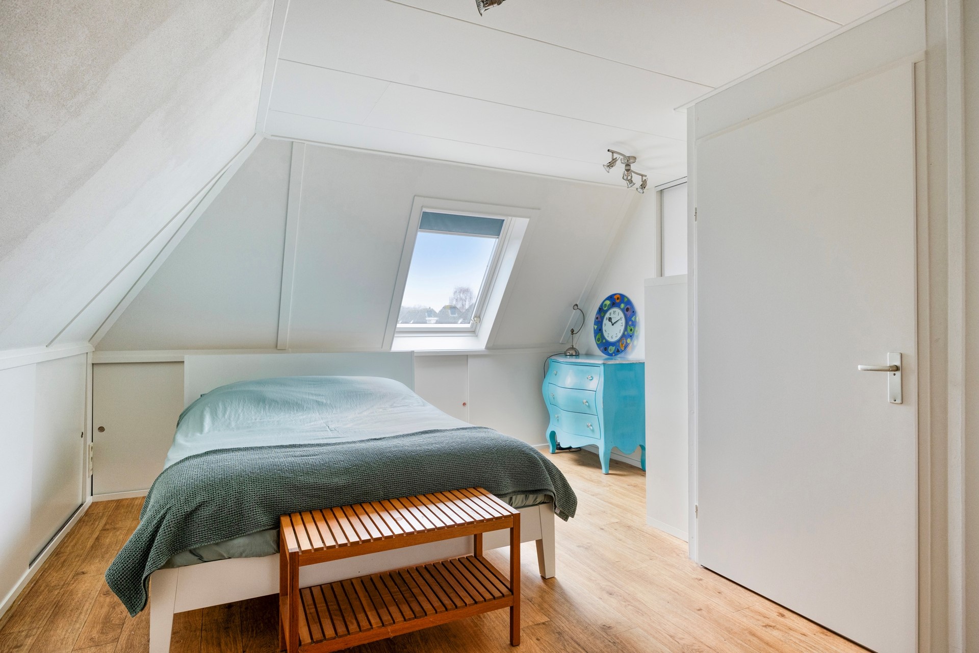 Grote slaapkamer met Velux dakraam aan de achterzijde, bergkast met schuifdeur, bergruimte achter de knieschotten. Op de vloer ligt zeil met een houtnerf. De slaapkamer is eenvoudig te splitsen, waardoor er twee slaapkamers ontstaan.