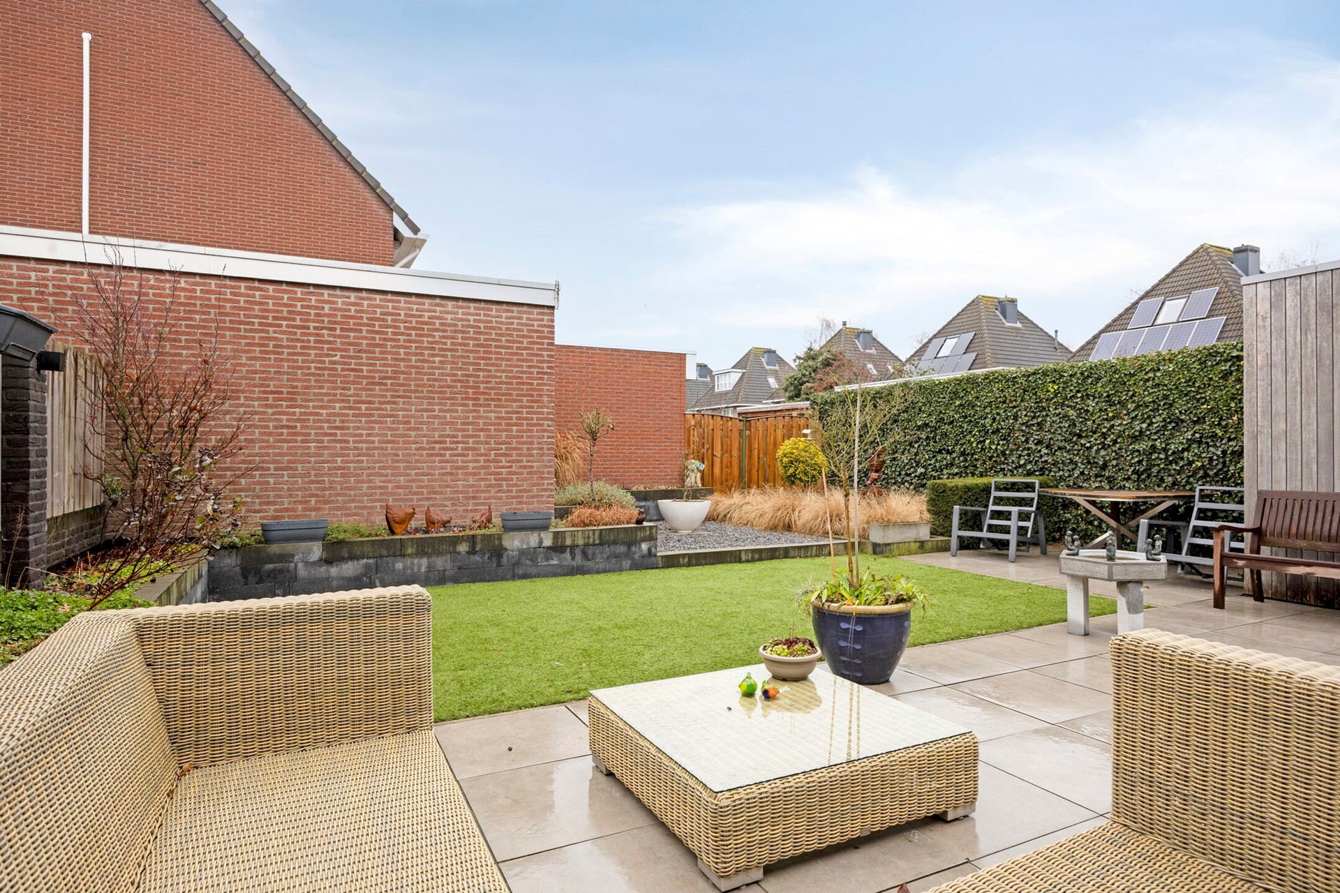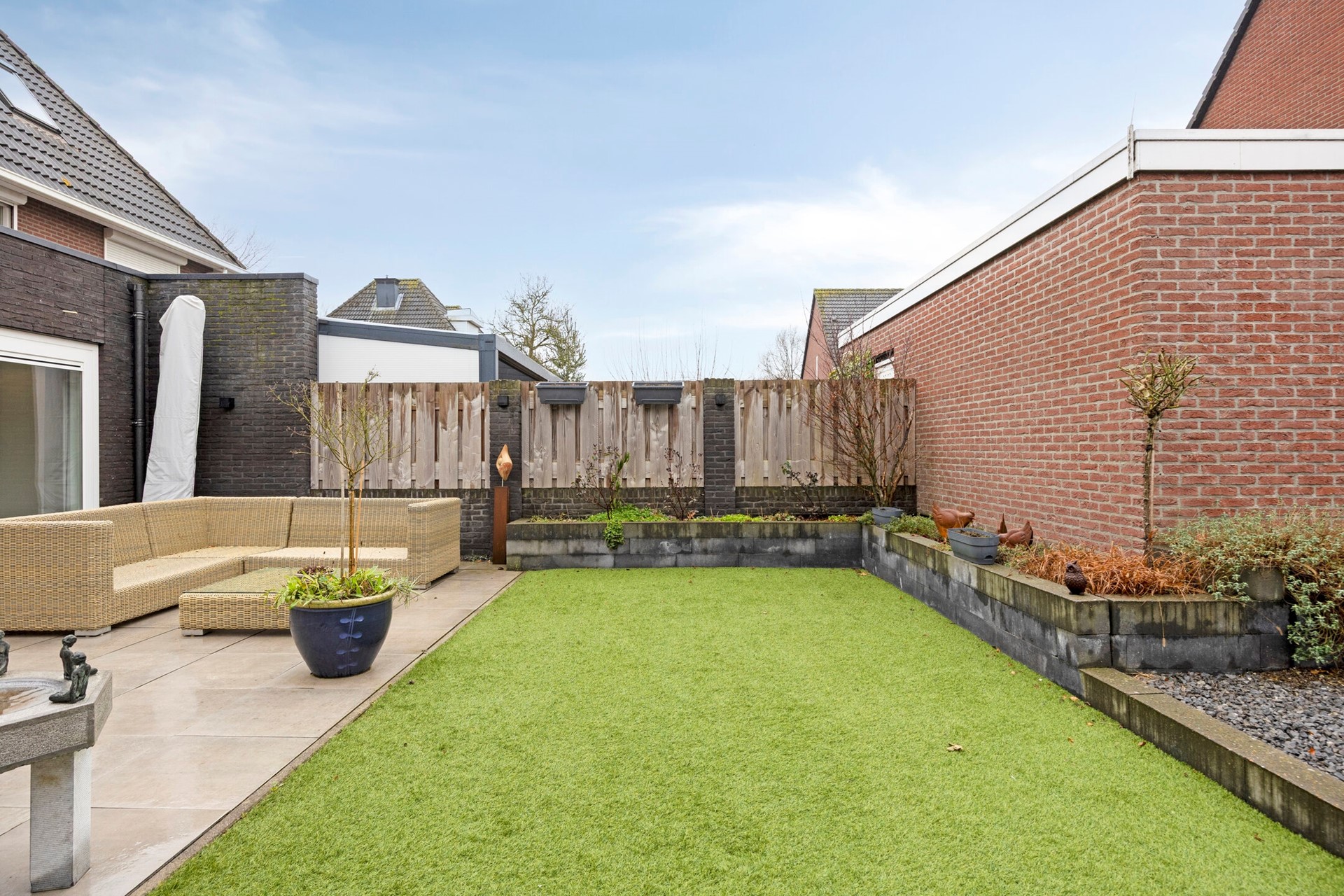 De omsloten achtertuin ligt op het (zuid)westen en heeft een groot aan de achterzijde van de woning grenzend terras met kunststof gazon en volgroeide borders.